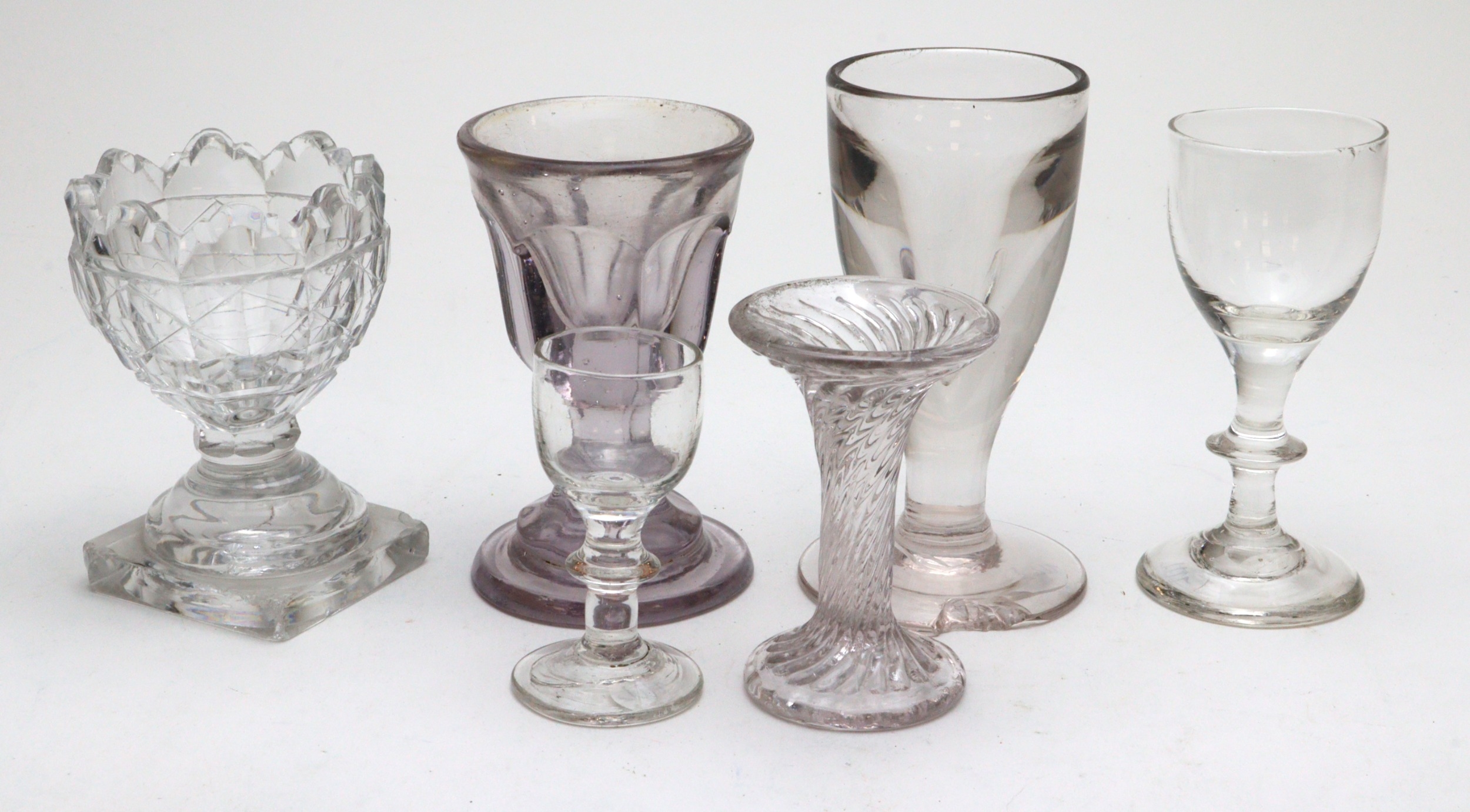 Mixed lot of drinking glasses (4) along with a small glass stand & a Georgian glass salt. All with some damage