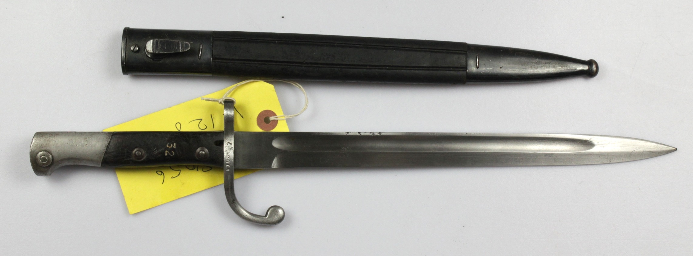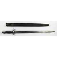 Bayonet: A good Brazilian Model 1908 rifle bayonet with hooked quillon. Blade 12" in very good condition. In its steel-mounted leather scabbard. Rack number "32" stamped to grips.