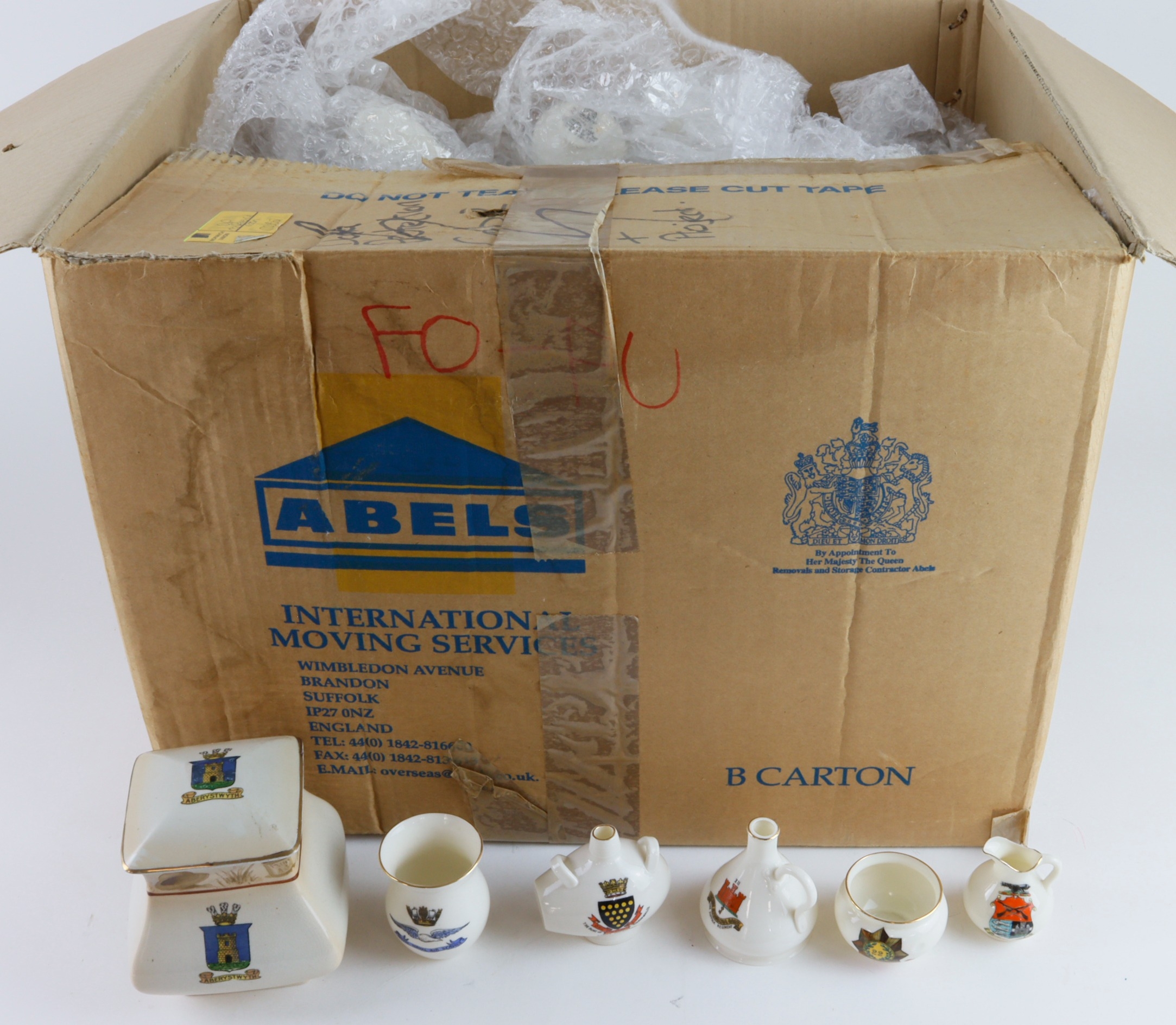 Crested China. A collection of approximately eighty pieces of crested china (including Military interest), items include suitcases, barrels, cannon, etc., makers include Arcadian, Carlton, etc.