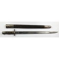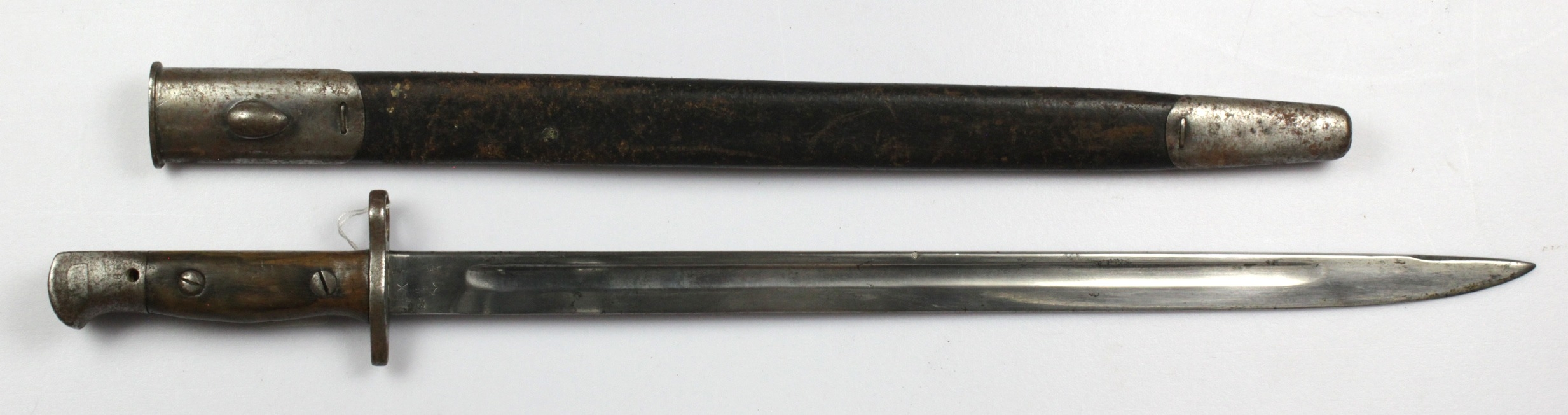 Bayonet: P'07. Early model by Sanderson dated 10.14 (Oct 1914). Clean, 17" blade. Good grips. Service wear overall. In its steel bound leather scabbard.