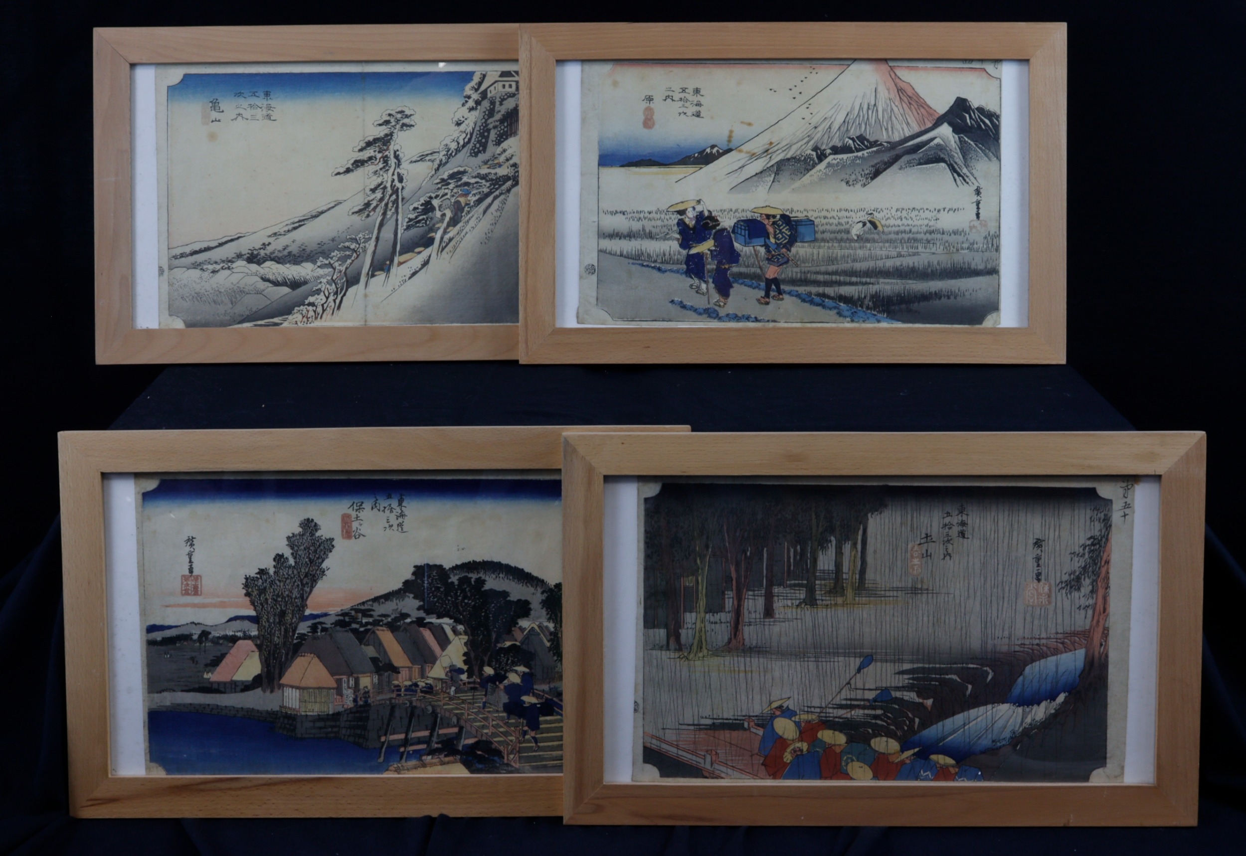 Utagawa Hiroshige (Japanese, 1797-1858). Four woodblock prints, all contained in modern frames, largest sheet size 37cm x 24cm approx.