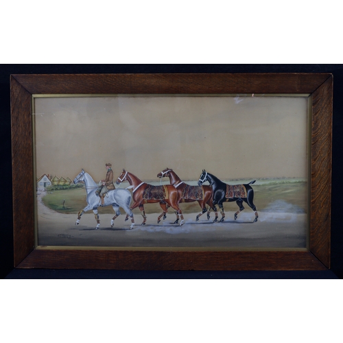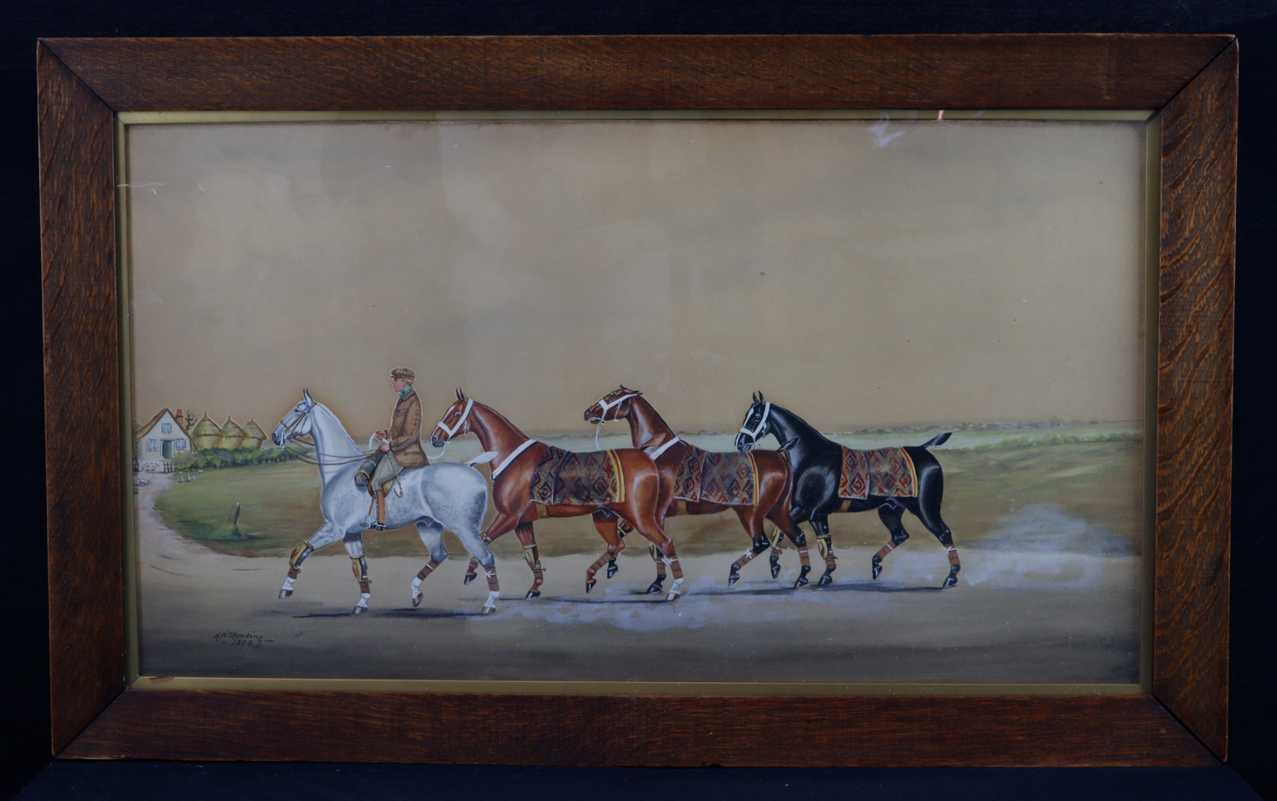 Henry William Standing (1894–1931). Watercolour, heightened with gouache, depicting a gentleman on a grey horse leading three further horses, signed and dated by artist to lower left 'H. W. Standing, 1899', framed & glazed, image size 68.5cm x 38.5cm approx.