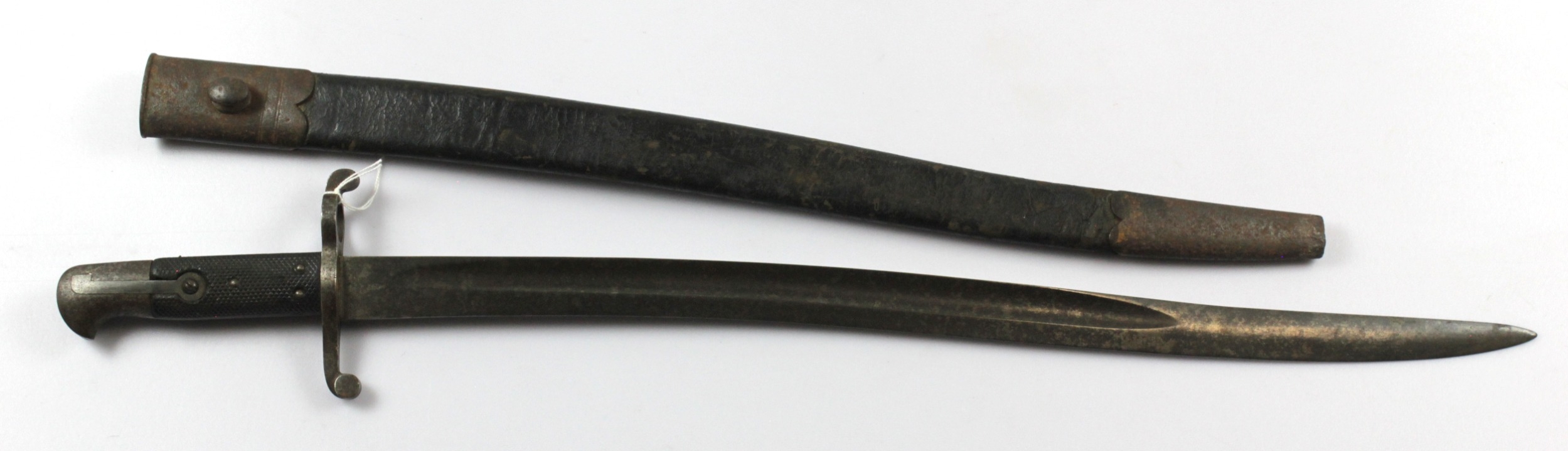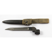 Bayonet scarce 1864 patten Wittworth sword bayonet similar to the 1856 pattern but with a round slot instead of the square type in its leather and steel scabbard VR with inspectors stamp to the blade.