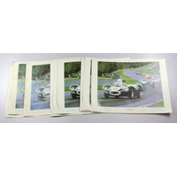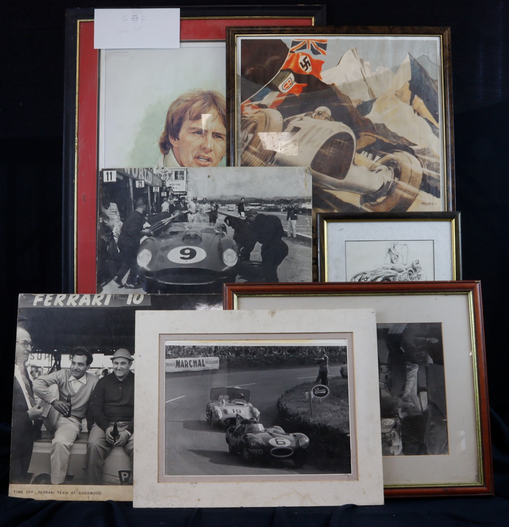 Motor Racing interest. A collection of Motor Racing related photographs, posters etc., including a limited edition print signed by Craig Warwick depicting Gilles Villeneuve (some framed and glazed, one with damaged glass), largest frame size 64cm x 80cm approx.