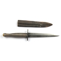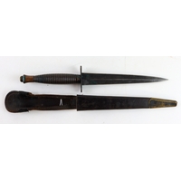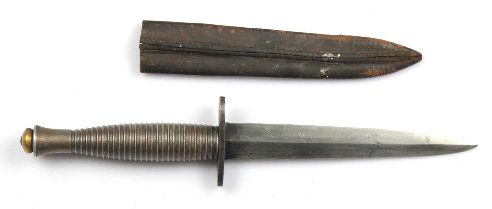F.S. Knife 3rd Pattern. Blade 5.75", has been sharpened & repointed. Ribbed grip with a numeral "1" on the pommel. In a leather scabbard covering just the blade (stitching as found). Possibly used as a boot knife?
