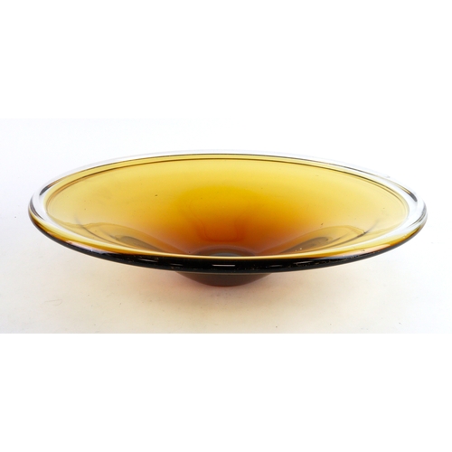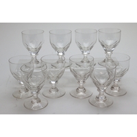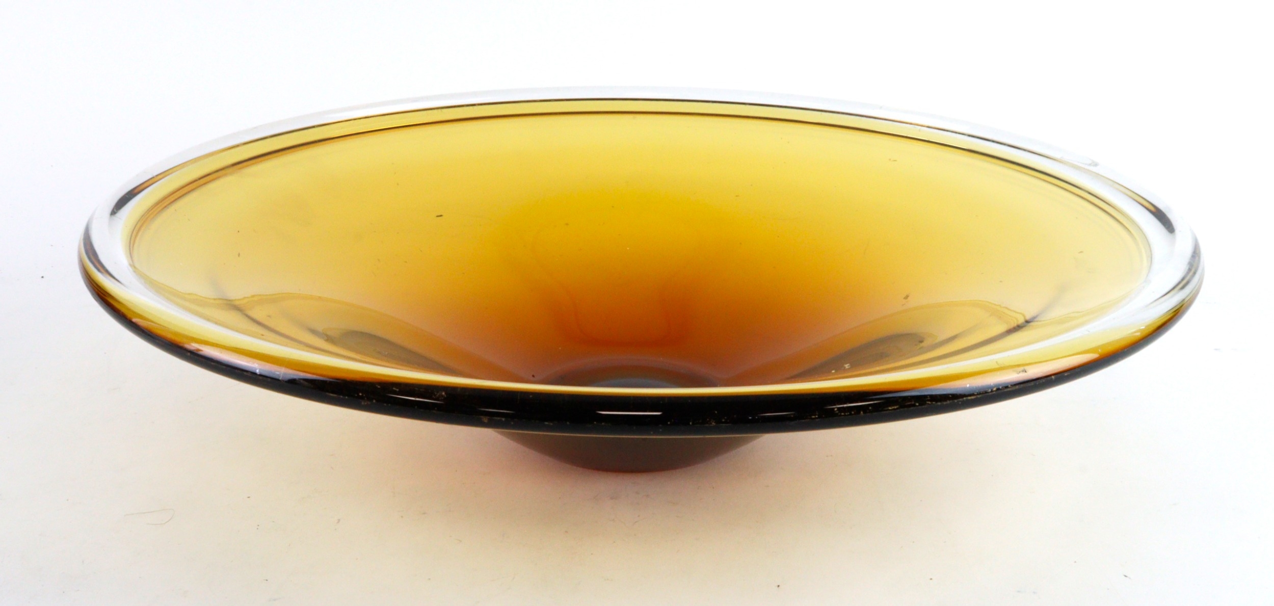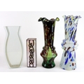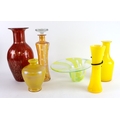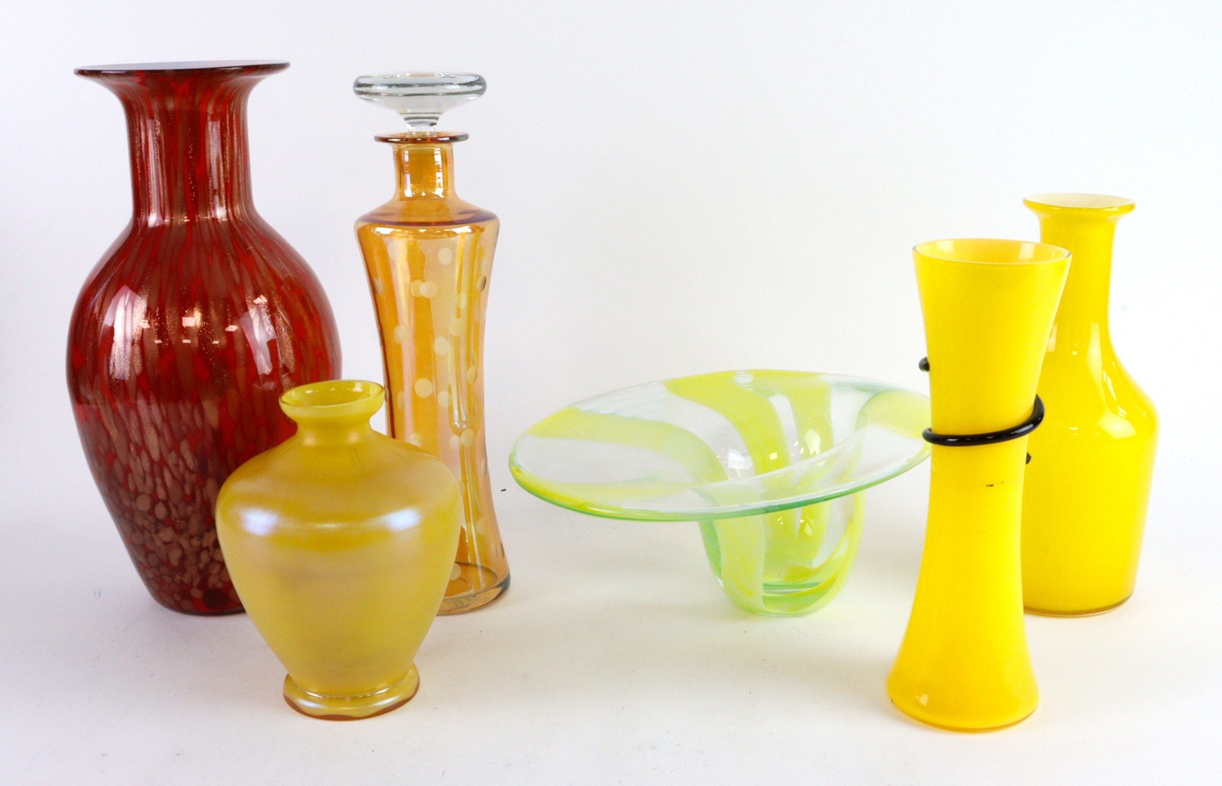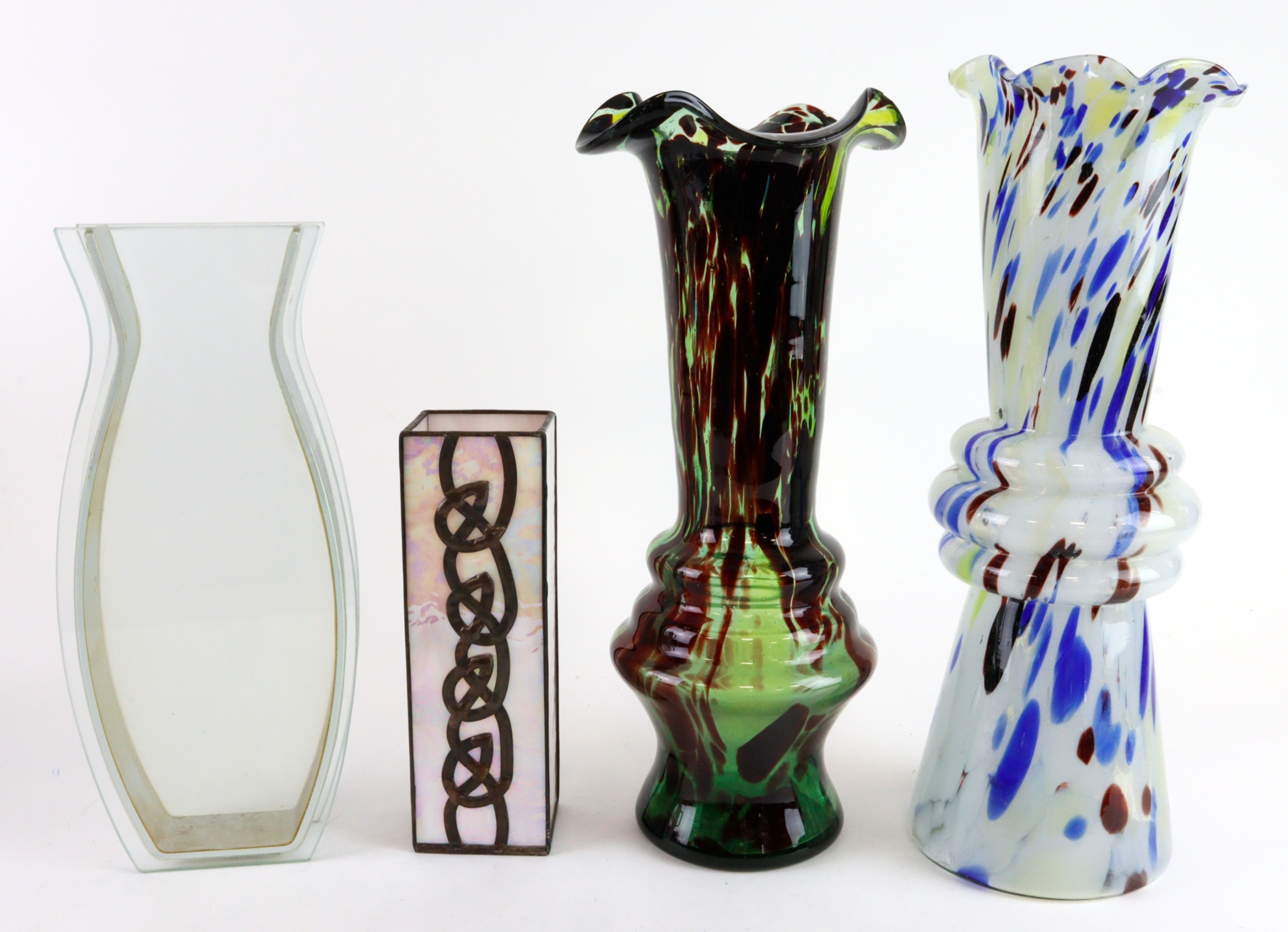 Glass lot of two large vases plus six vases ,one shaped decanter plus two dishes ( one very large)-various eras -( one vase has slight chipping to its top) ( eleven items in all approx)