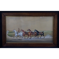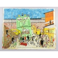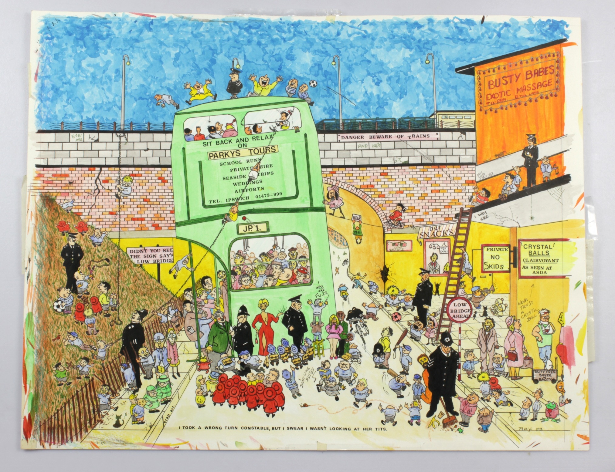 Giles style humour - hand painted cartoon by 'Ray' in 2005. Ipswich Green Bus stuck under a viaduct, and titled "I took a wrong turn Constable, but I swear I wasn't looking at her tits". 21" x 16.5", unframed