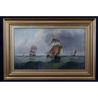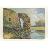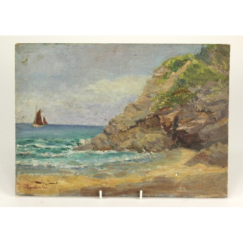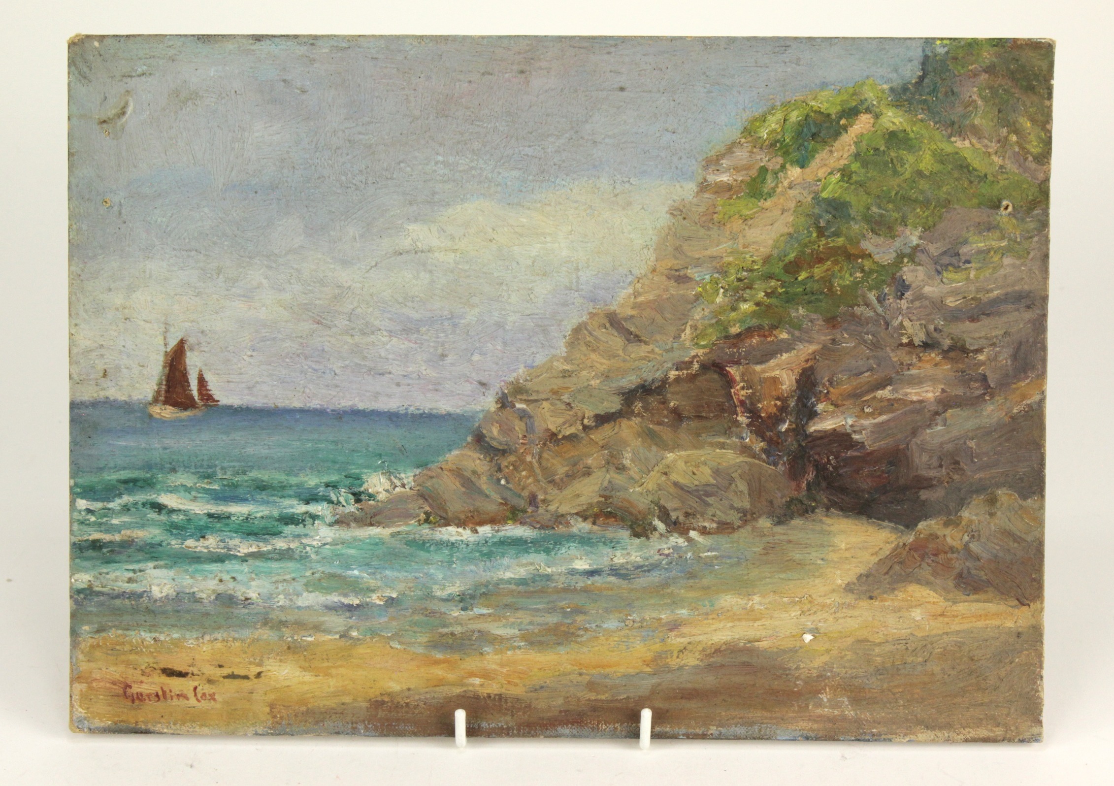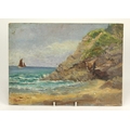 Garstin Cox (1892-1933). Oil on board, depicting a coastal scene with cliffs and a boat out at sea, signed by artist to lower left, reverse reads 'Garstin Cox, Cornish Coast, 1920', 35cm x 25cm approx.
