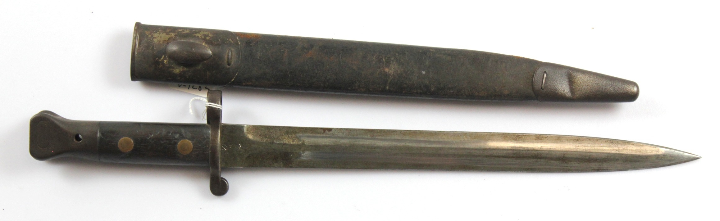 Bayonet: A Pattern 1888 MkIII bayonet in its steel-mounted leather scabbard, stitching 100%. Blade marked "ER 12.01 Wilkinson London" WD & bend X to ricasso. Service wear overall. Small crease to chape.