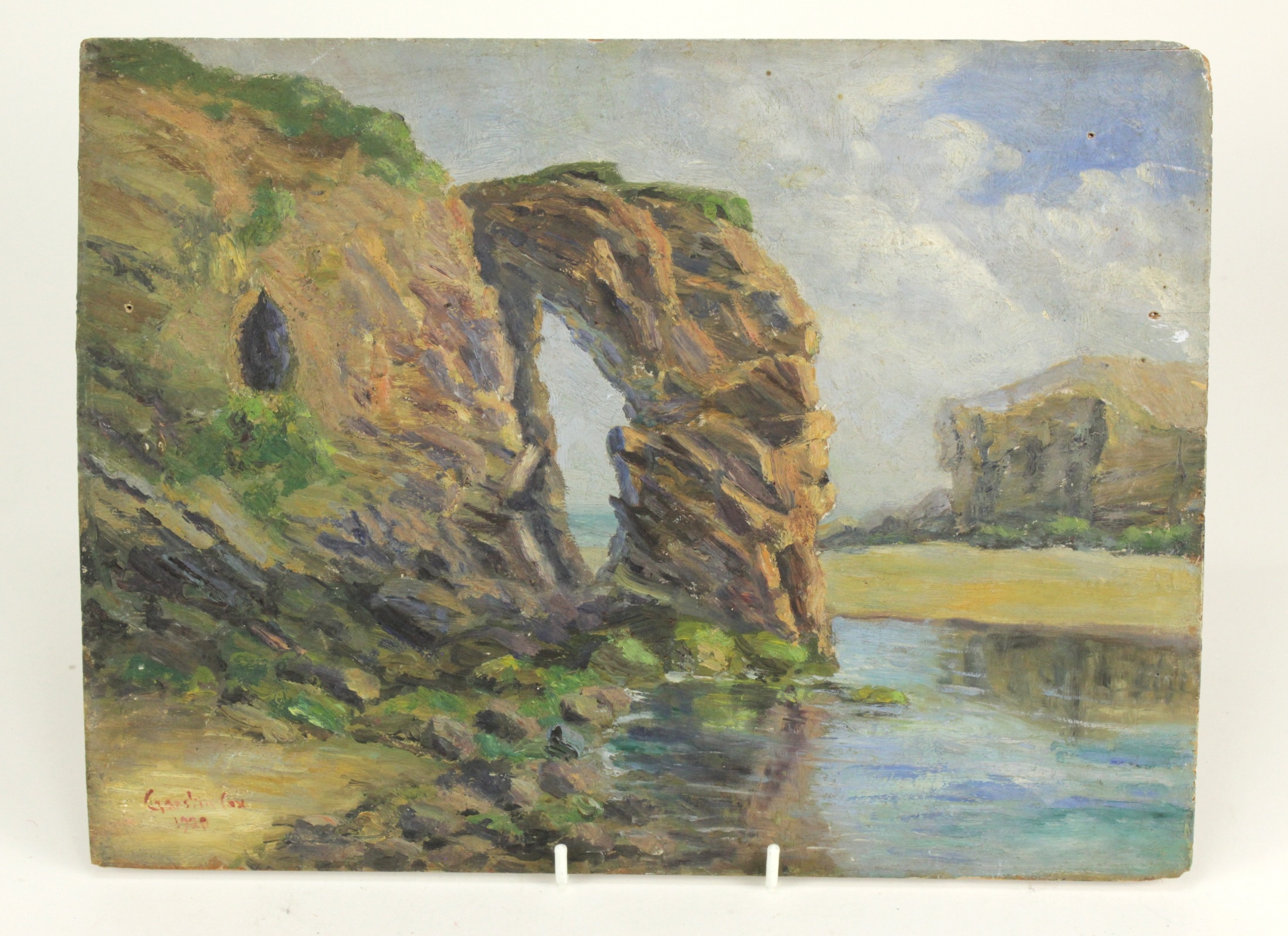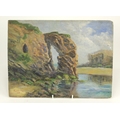 Garstin Cox (1892-1933). Oil on board, depicting a coastal scene with large rock, signed and dated (1920) by artist to lower left, remains of paper label to reverse reads 'Arched Rock, Perranporth', 35cm x 25cm approx.