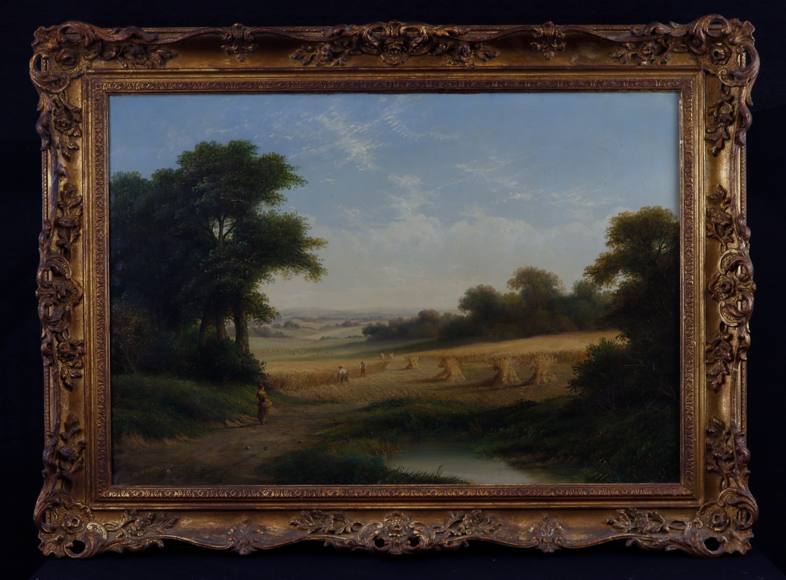 Walter Heath Williams (1836-1906). Oil on canvas, depicting a landscape of farm workers harvesting a field, with a pond in the foreground, signed by artist to lower left 'W. H. Williams', contained in a gilt frame, image size 64cm x 44cm approx.